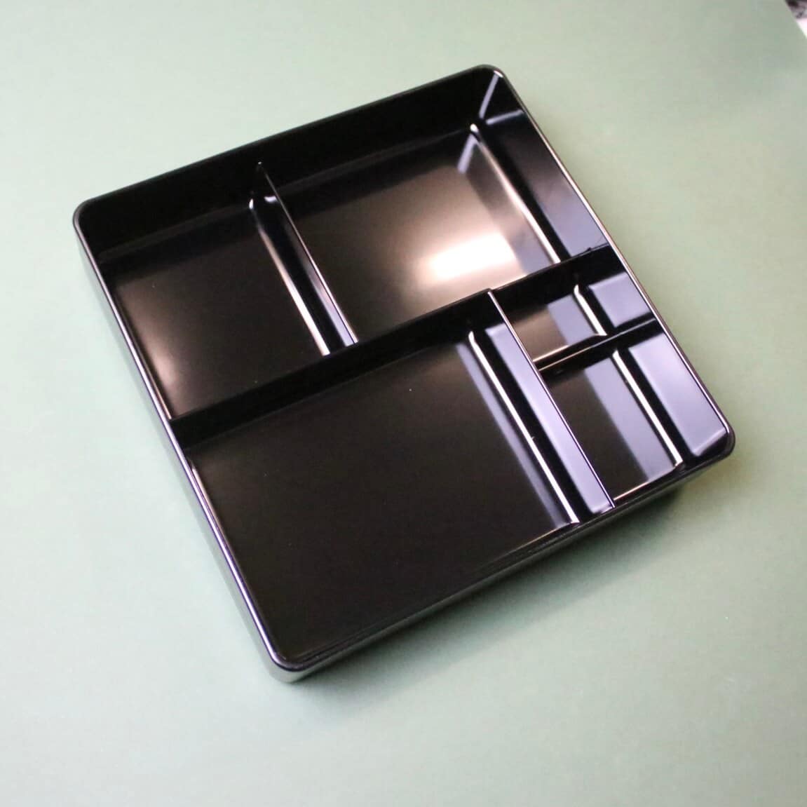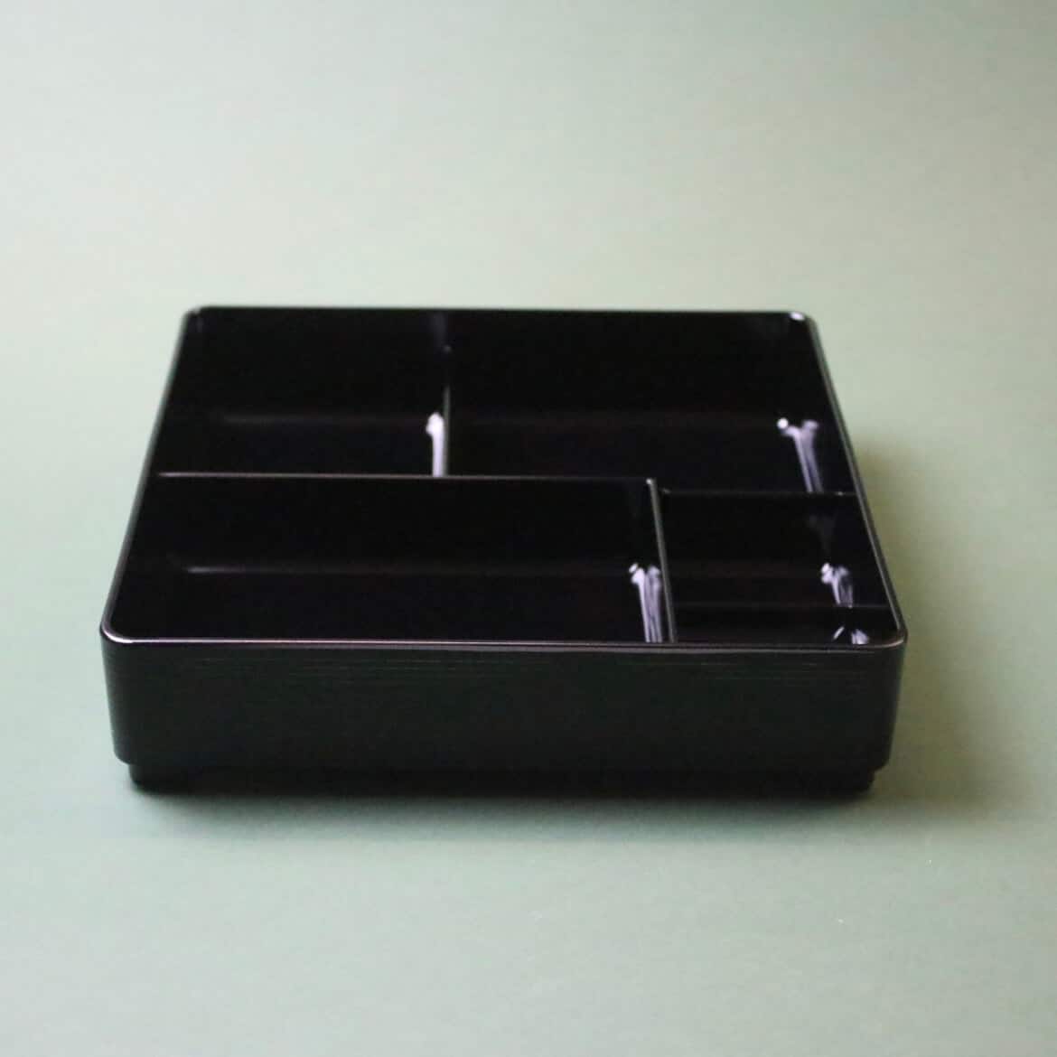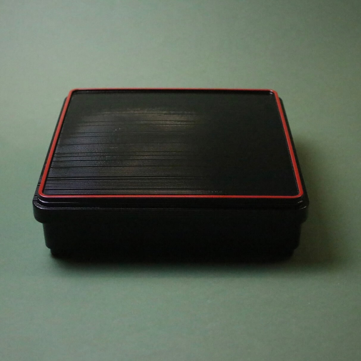 Bentolåda med lock i röd och svart klassisk stil som vi kanske är vana att se en japansk maträtt med flera små fack.